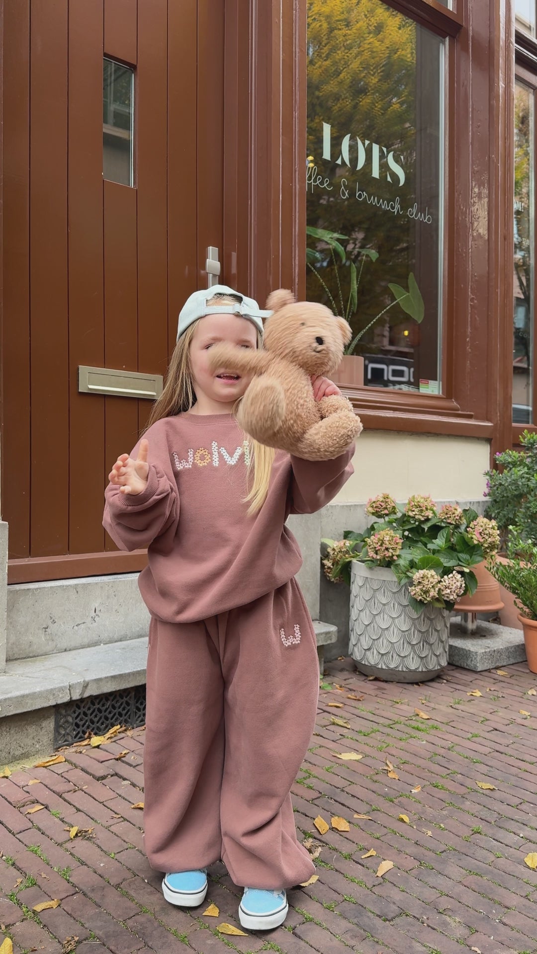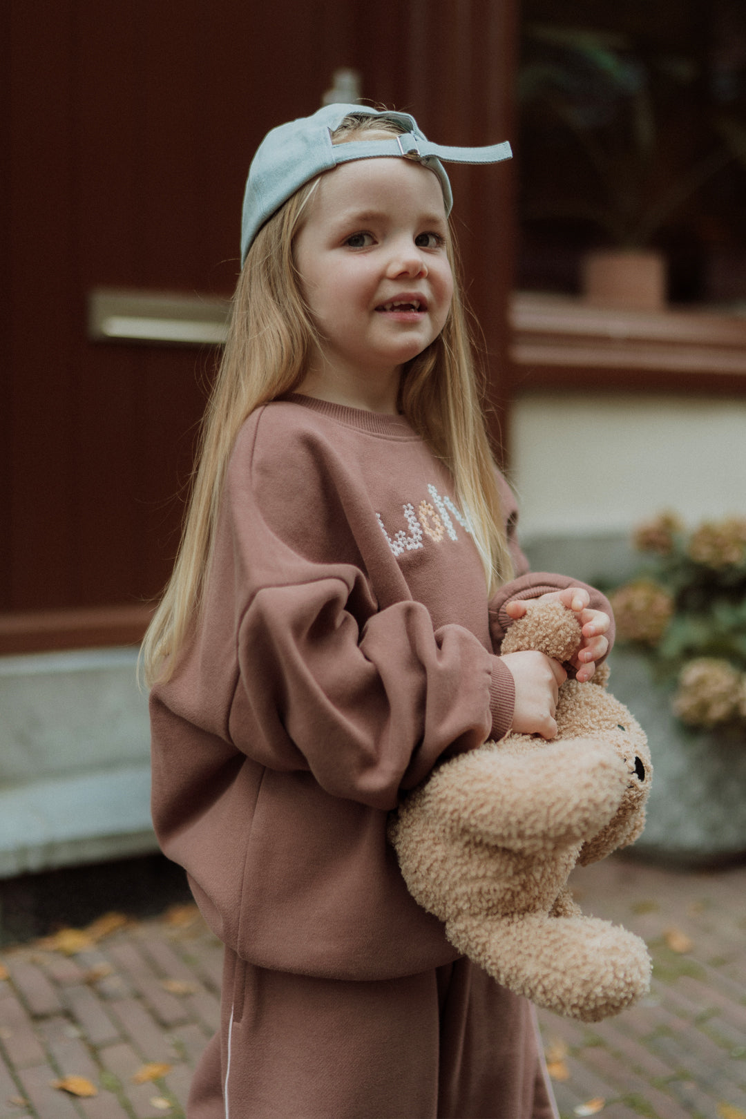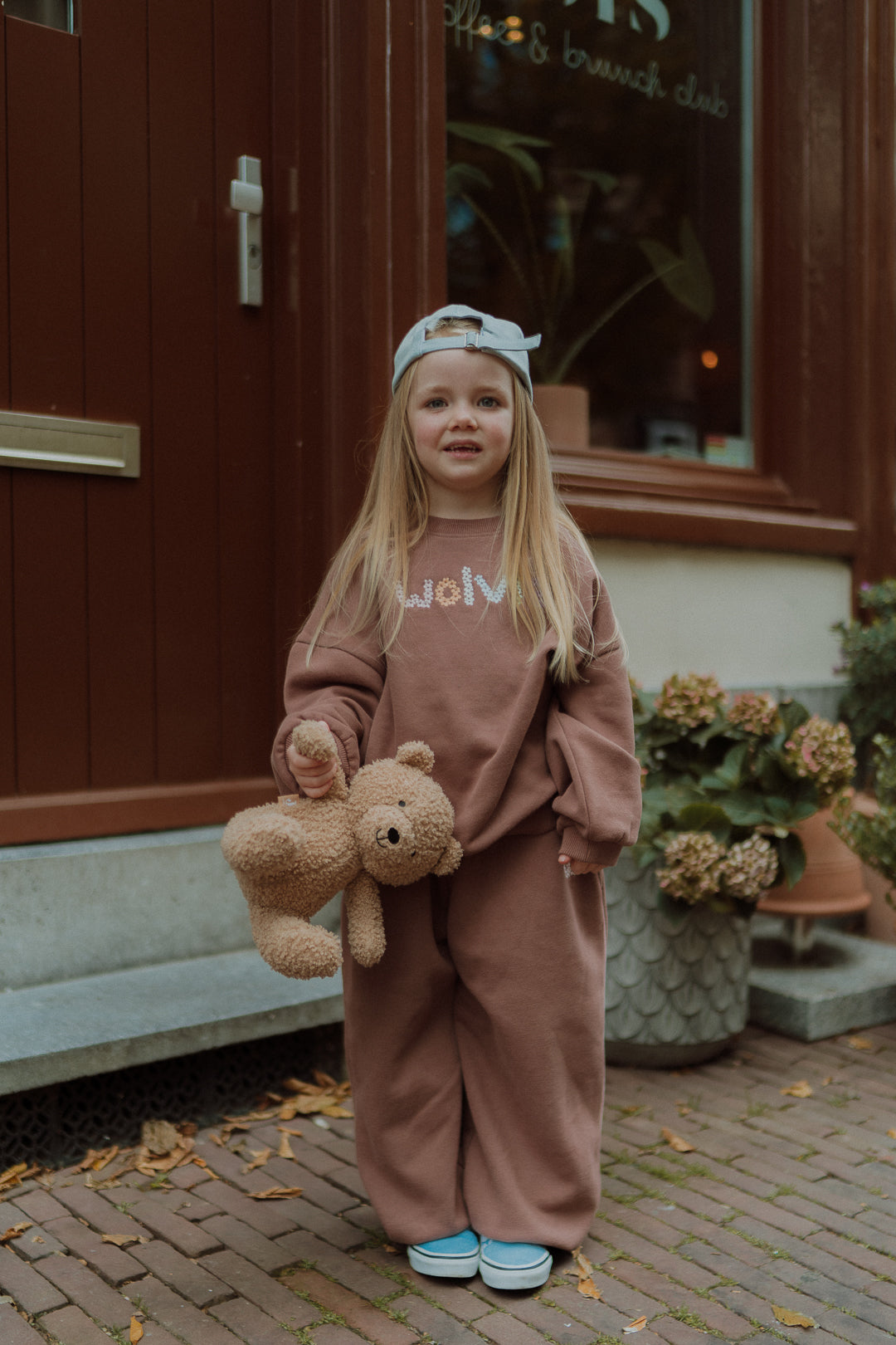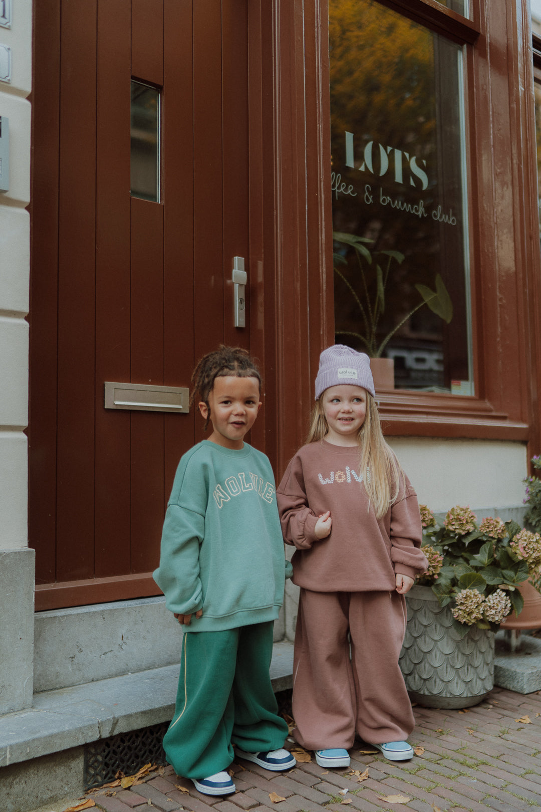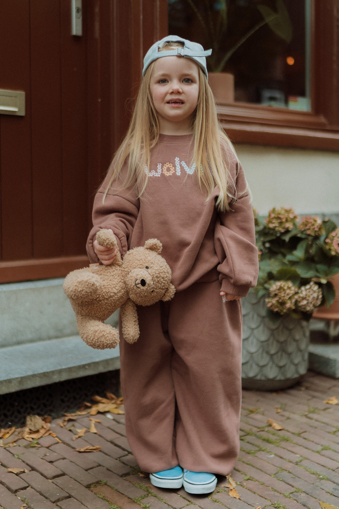 The color Coco Mauve is a soft, warm brown with a hint of dusty mauve. On the chest, you’ll find our Wolvie logo in signature pastel colors, adding a fun touch to this comfy piece.