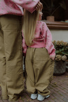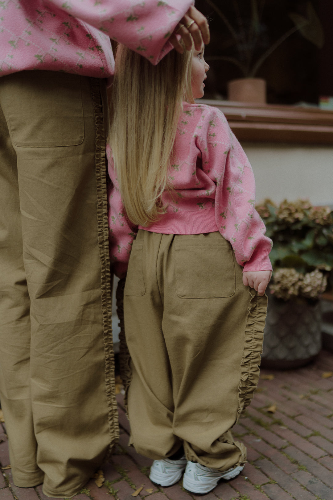 Meet our Jacky Army Green Pants for girls! These army green pants with a relaxed fit and fun ruffle detail on the side are made for girls who love to move, play, and look stylish while doing it. Crafted from 100% thick organic cotton, they’re perfect for school days, playdates, or family outings. Pair them with our Olivia Pink Cardigan for girls or one of our cozy sweaters for that effortlessly cute look – just like mom! 💚