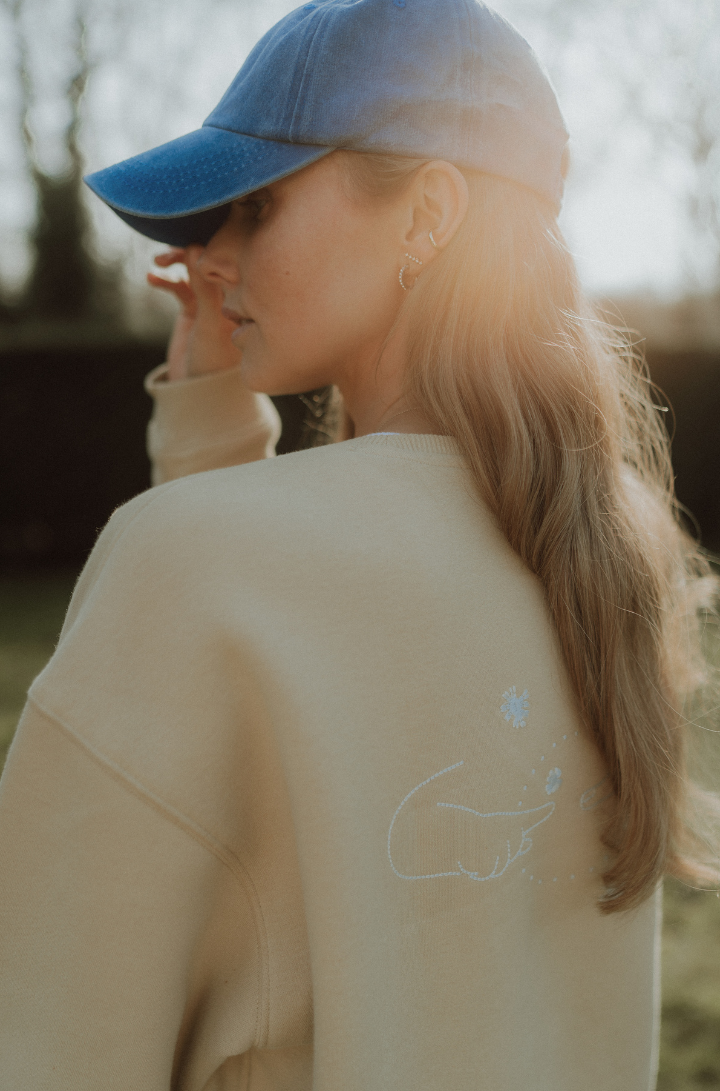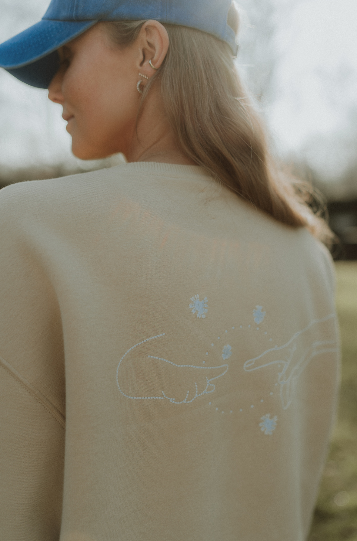 On the back, you'll find an embroidered design of two hands in light blue, a delicate yet bold statement that adds an extra touch of charm to this cozy staple. Whether you're lounging or not, this sweatshirt is as comfy as can be!
