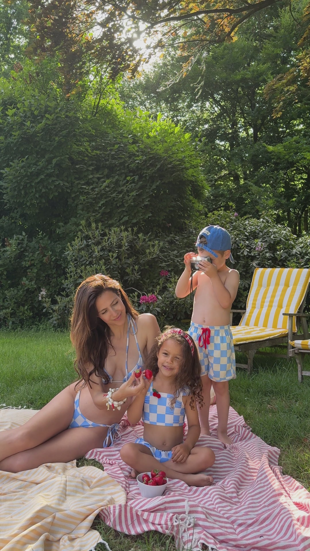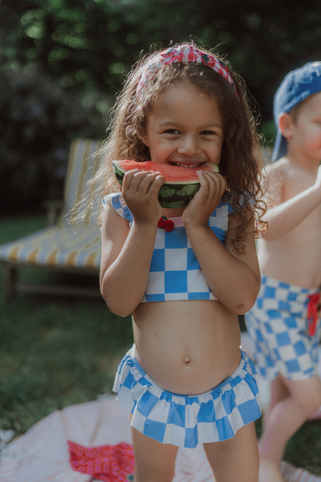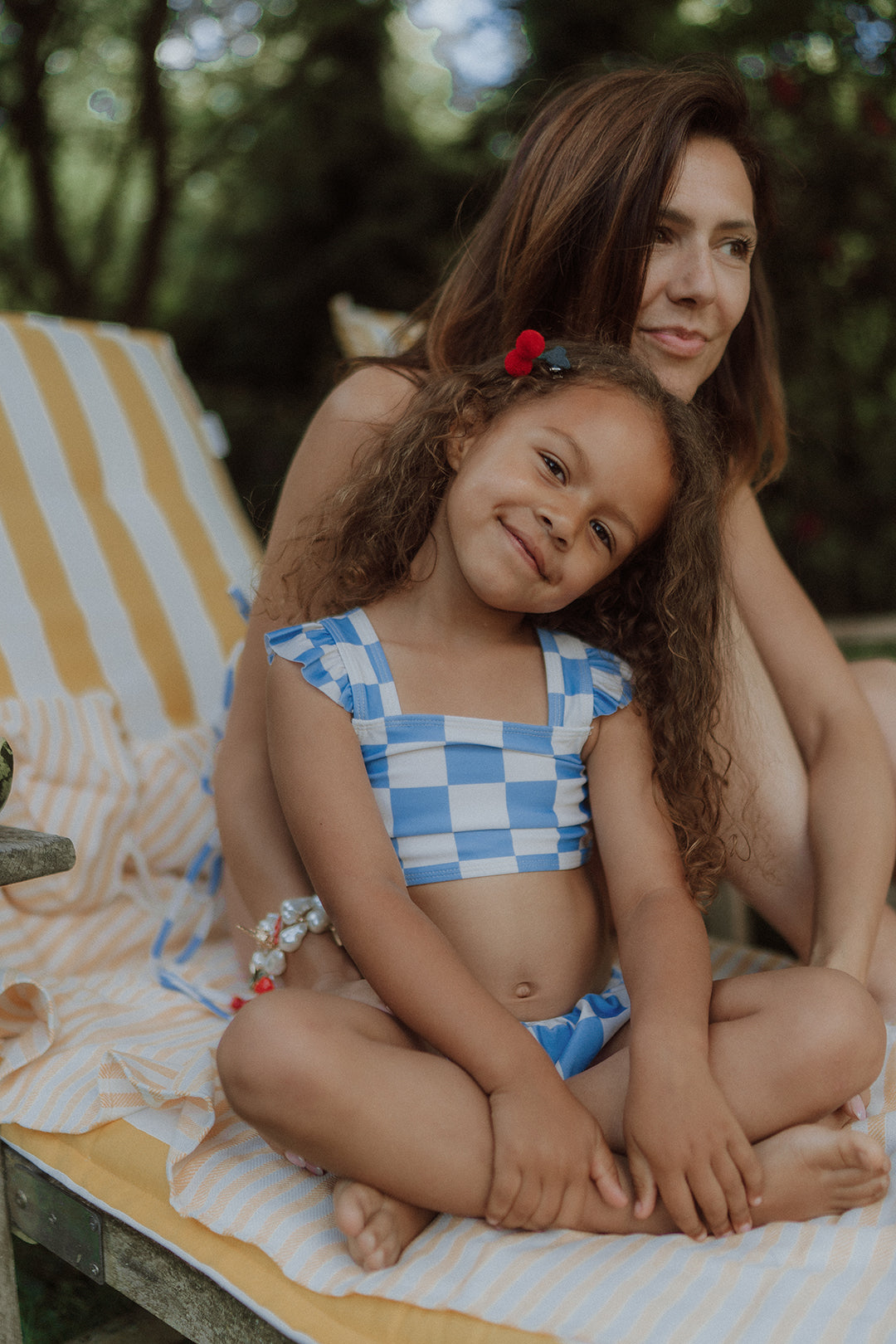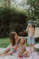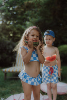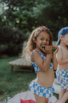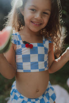 Say hello to our first-ever Wolvie bikini for girls - featuring the cutest light blue and ecru checkered print and a cherry clip. 🩵🤍🍒 Soft, stretchy, quick-dry material for all-day adventures. This bikini moves with your girl, wherever summer takes her. Plus: it features a cherry hair clip your mini can wear 2 ways: (1) in her hair, or (2) clipped onto her bikini for a fun, fruity twist.