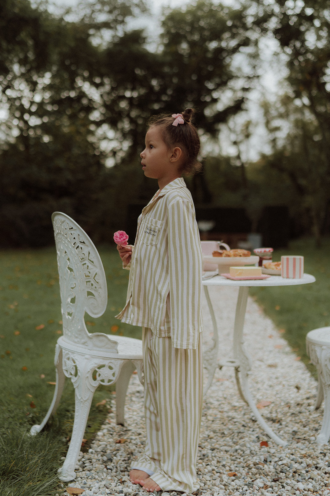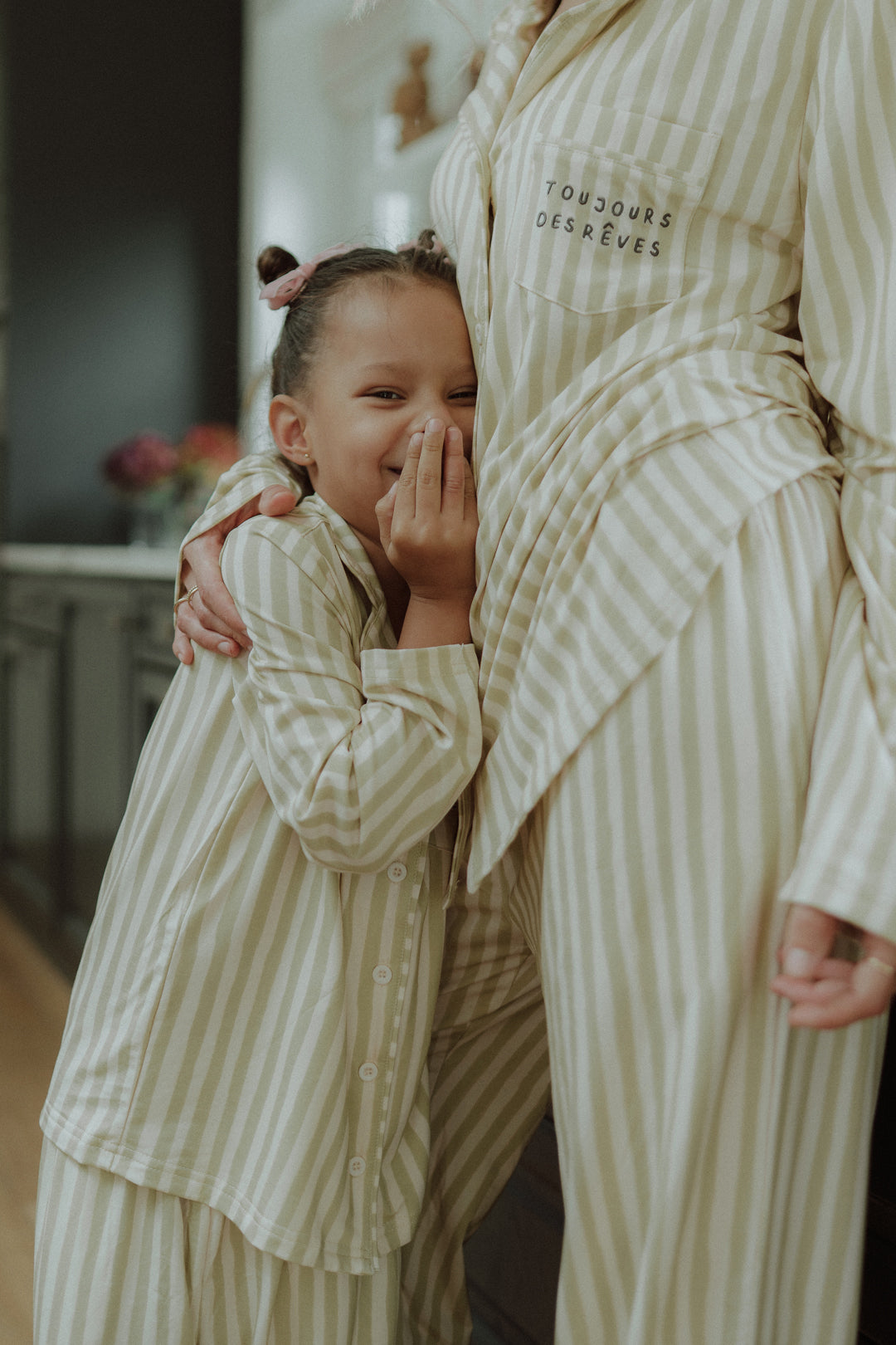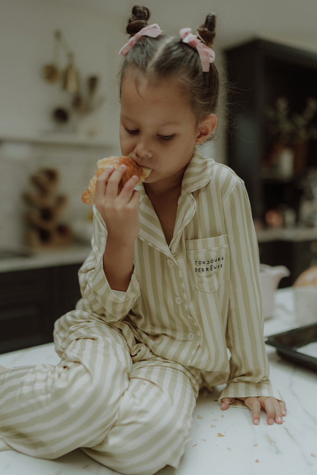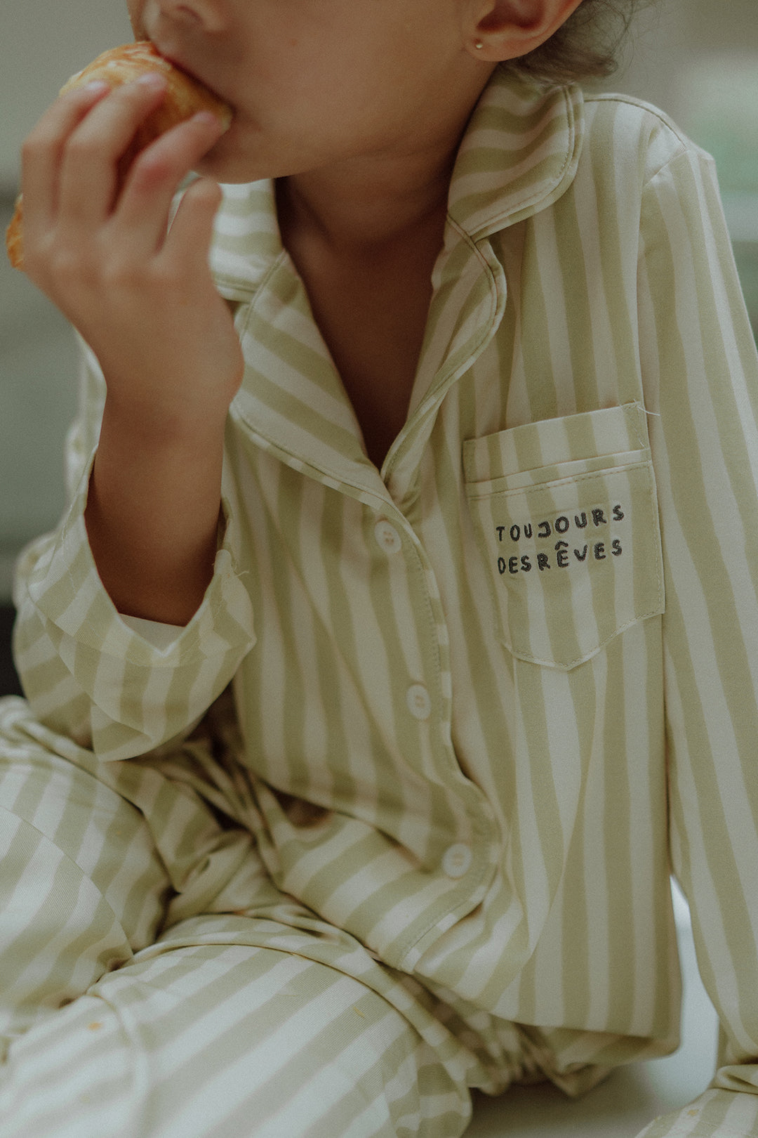 The illustrated olive green & ecru stripe gives it a playful yet timeless look, while the chest pocket embroidered with the words Toujours des Rêves (always dreaming) adds a little touch of magic.