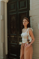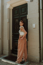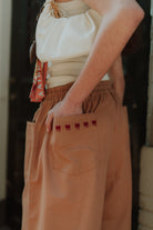 Meet our Chloé Camel Embroidery Pants, crafted from a beautiful natural blend of organic cotton and linen, with a burgundy bow detail on the back pocket. These trousers can be cropped at the bottom of each leg, creating the perfect easy-going balloon shape.