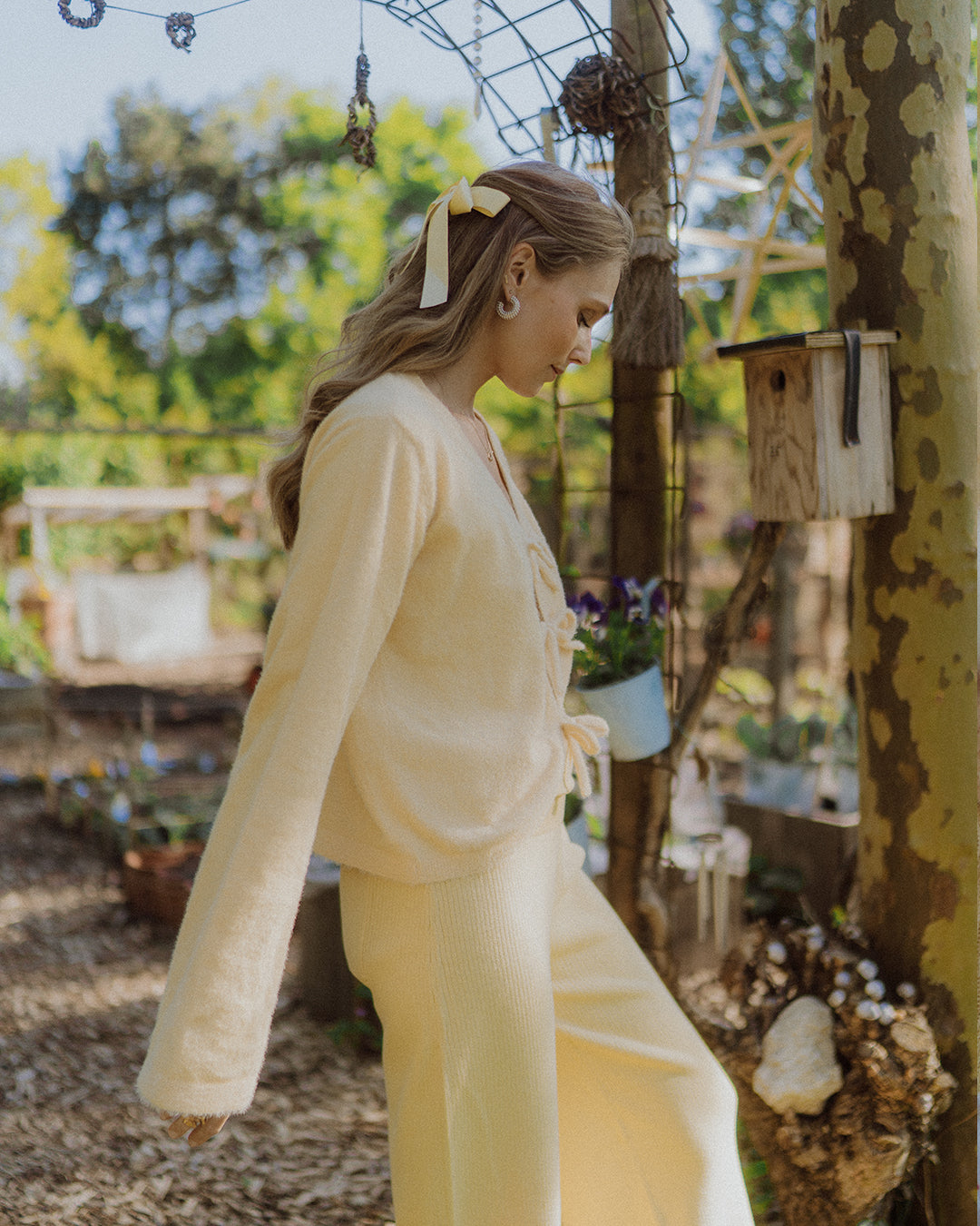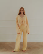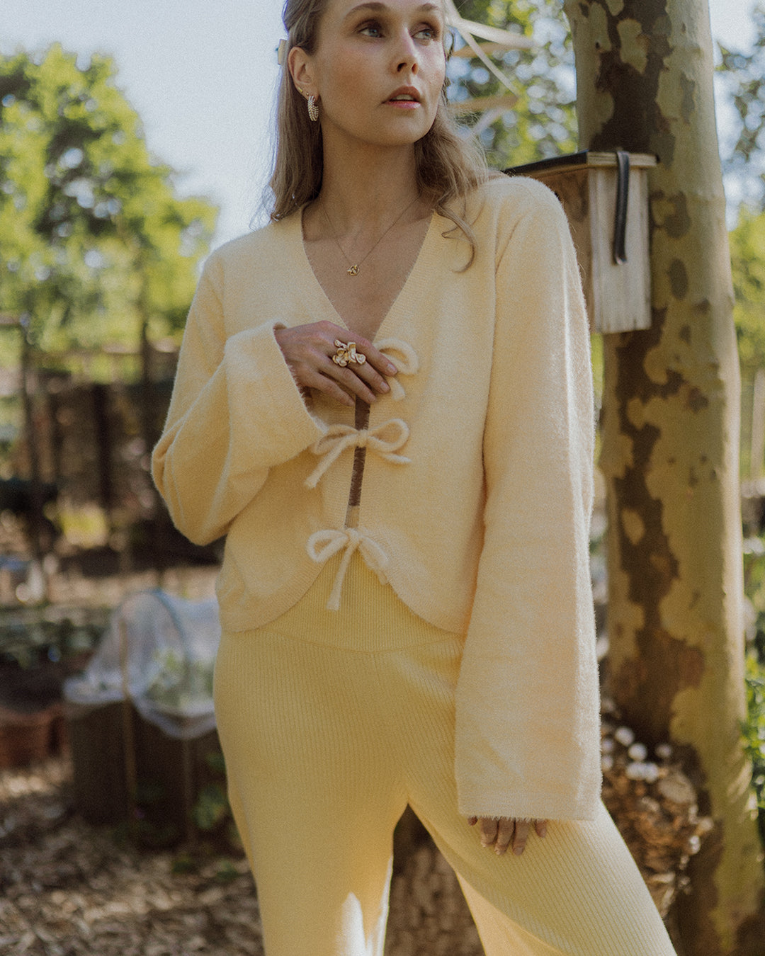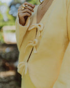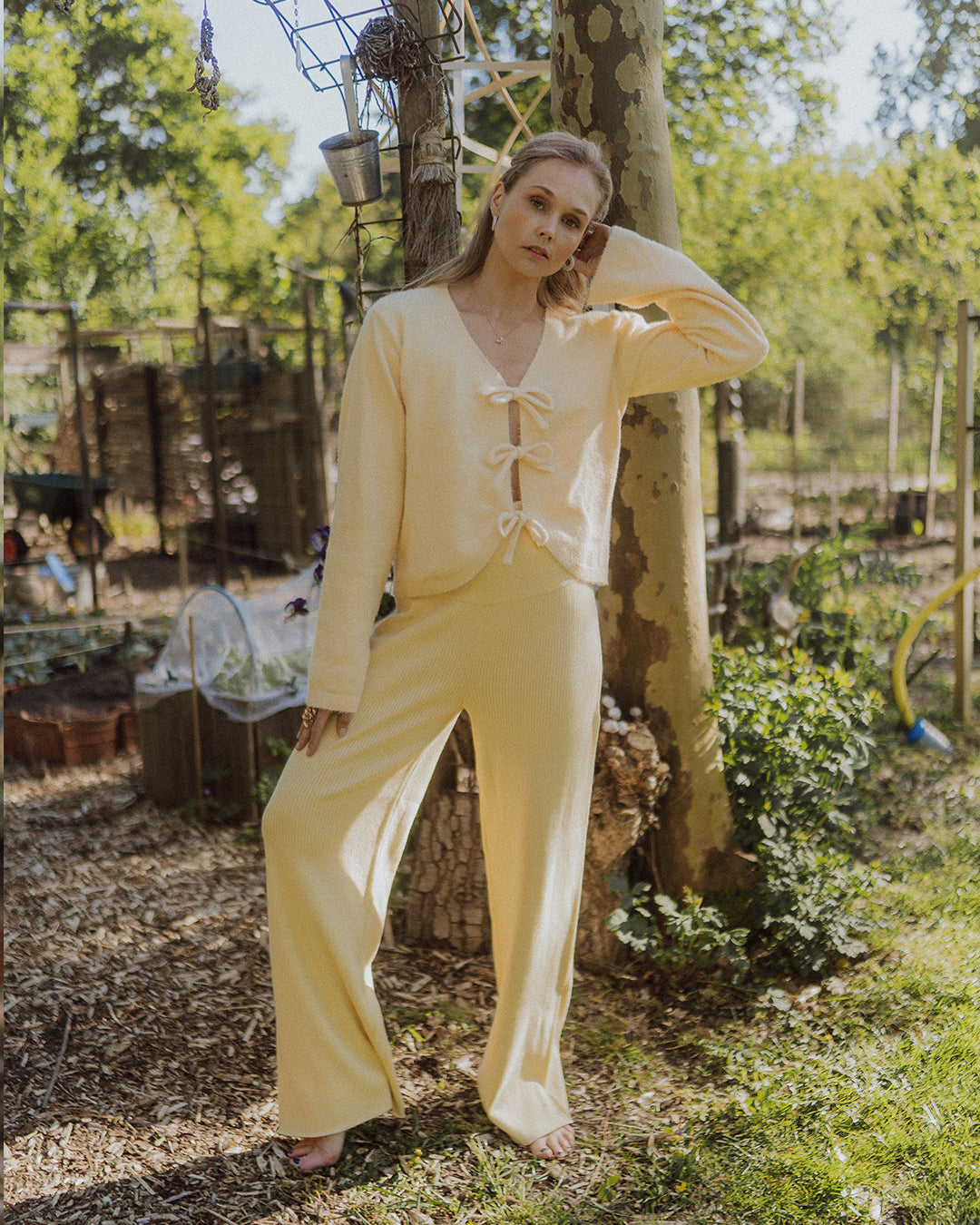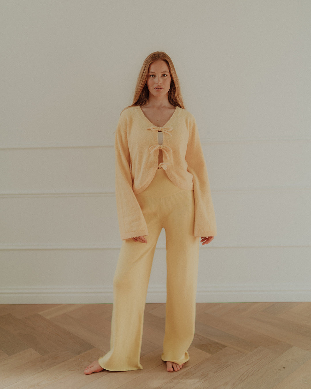 Say hello to the Bowie Cardigan in Butter Yellow - the perfect blend of cozy and chic! Featuring a V-neck, long wide sleeves, and three tie closures, this stylish staple is effortless, elegant, and oh-so-soft. Wearing it with a white top underneath or without (just like our model Iris does), however you like it. Team it with our Lola in Butter Yellow for a full yellow look.